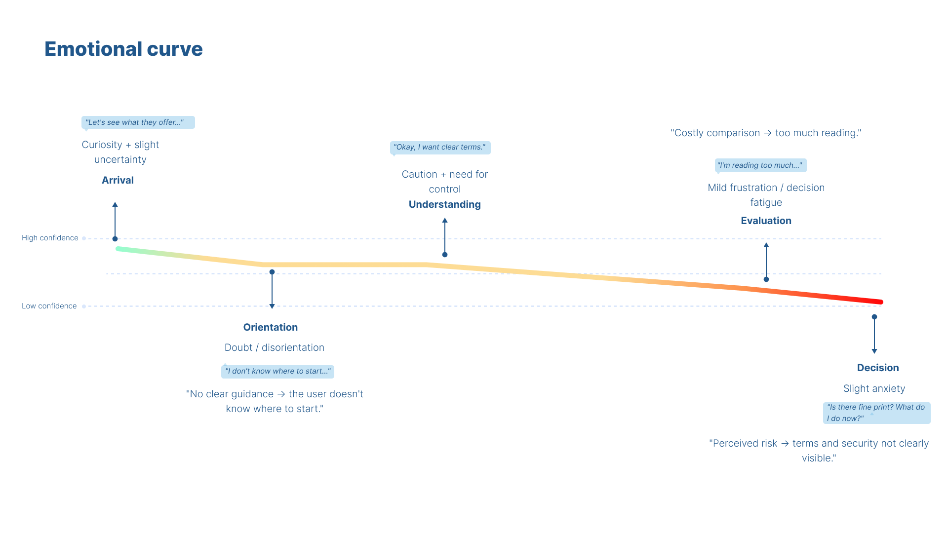Research synthesis (persona, journey mapping, emotional curve analysis) highlighted three critical moments of friction: